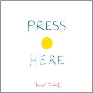 press hereI was recently browsing around at my favorite local children’s bookstore and overheard a woman and her little girl arguing over a book. The mom was trying to talk the (rather, shall we say, difficult) child into buying a Margaret Wise Brown book (God bless her) and the little girl sat right down in the middle of the aisle and said–and I quote–“I don’t want a book. A book doesn’t do anything.” After reviving myself with smelling salts, I thought about how perhaps there are more little girls and boys around the world (horrors!) who might feel this way and it made me awfully sad. Because books do the most amazing things without actually doing anything at all. You know that. I know that. And luckily, I think all of my readers’ children know that.  But for those children out there who keep waiting for their books to talk in funny voices or play music or run around the house like literary robots, I hope that one day they find that one book that teaches them that the words on the page bring to life more than any game, any toy, any electronic doo-dad they could imagine. Amazingly, as I returned to that same bookstore this week I came across one of the most wonderful books to come along in some time – and it, quite ironically and whimsically, fits into this little soapbox speech of mine. Herve Tullet’s Press Here reminds children and adults alike that the magic of the word and the picture is truly that….magic. Acting as an interactive narrator, Tullet’s book asks the reader to follow the instructions throughout the book. “Press here and turn the page” it says and, lo and behold, that small touch has created something new on the following page. This is a wonderfully imaginative, wry and stunning book that, if nothing else, will remind us of the sheer brilliance of children’s books and the amazing powers of our own minds and fingers.