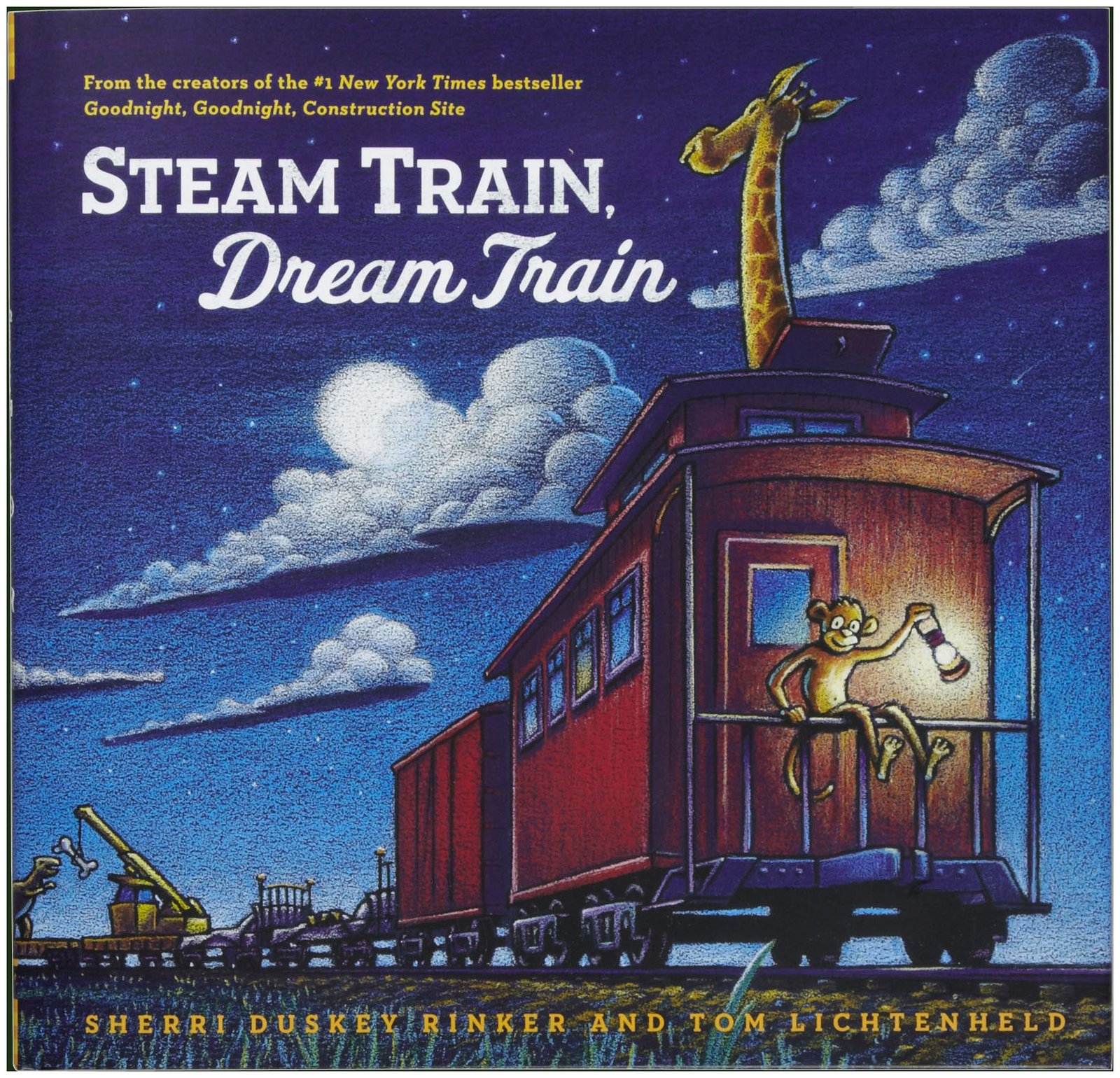 steam-train-dream-trainThere is just something about trains and children. Both of my boys were avid train aficionados in their younger years and absolutely devoured any book that even remotely mentioned locomotives. Freight Train by Donald Crews, Two Little Trains by Margaret Wise Brown and I Love Trains by Philemon Sturges and Shari Halpern being three of their all-time favorites. Now you put trains and TOYS together, and you’ve got the makings of an instant success! I only wish my boys were a bit younger so they could truly immerse themselves once again in the world of train fiction, particularly with the publication of Sherri Duskey Rinker and Tom Lichtenheld’s Steam Train, Dream Train. This lovely little book, by the same power team behind Goodnight, Goodnight, Construction Site (another must-have!), has all the same rhythmic appeal of Brown’s classic, Goodnight Moon, with the added appeal of circus animals, toys, ice cream sundaes and even dinosaurs! Hidden within the delightful rhyming text, train vocabulary words are written in bold for an extra benefit of educating your children on the various parts of a train. This is a beautiful book, perfect for bedtime, and ideal not only for the overtly obsessed train lovers, but for engineers in training and the ones who love them.