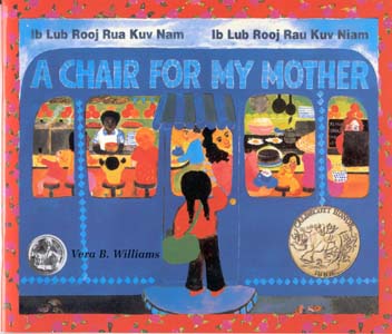 Occasionally, a children’s book makes me cry. It happened when I first read Tomie dePaola’s “Now One Foot, Now the Other” (I’ll review that soon…tears galore) and it happened again with Jan Karon’s “Miss Fannie’s Hat”…For those of you who have had the good fortune of reading either of those, you’ll see the pattern. Children’s books that have grandmother’s in them seem to pull my heartstrings a little tighter than others. And for those of you who knew my grandma Deedles, you’ll know why. The latest addition to this esteemed (and rather soggy list) is Vera B. Williams’ “A Chair for My Mother” – a gorgeous, heartwarming tale of a little girl, her mother and grandmother who are saving money for a comfortable chair. All of their possessions were burned in a fire and, although neighbors have graciously given them all sorts of hodgepodge furnishings, what they really would love is one soft chair to sit in.